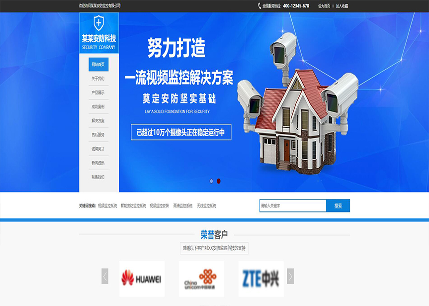 模板名稱:(帶手機版數據同步)自適應安防監控器材類藍色網站模板